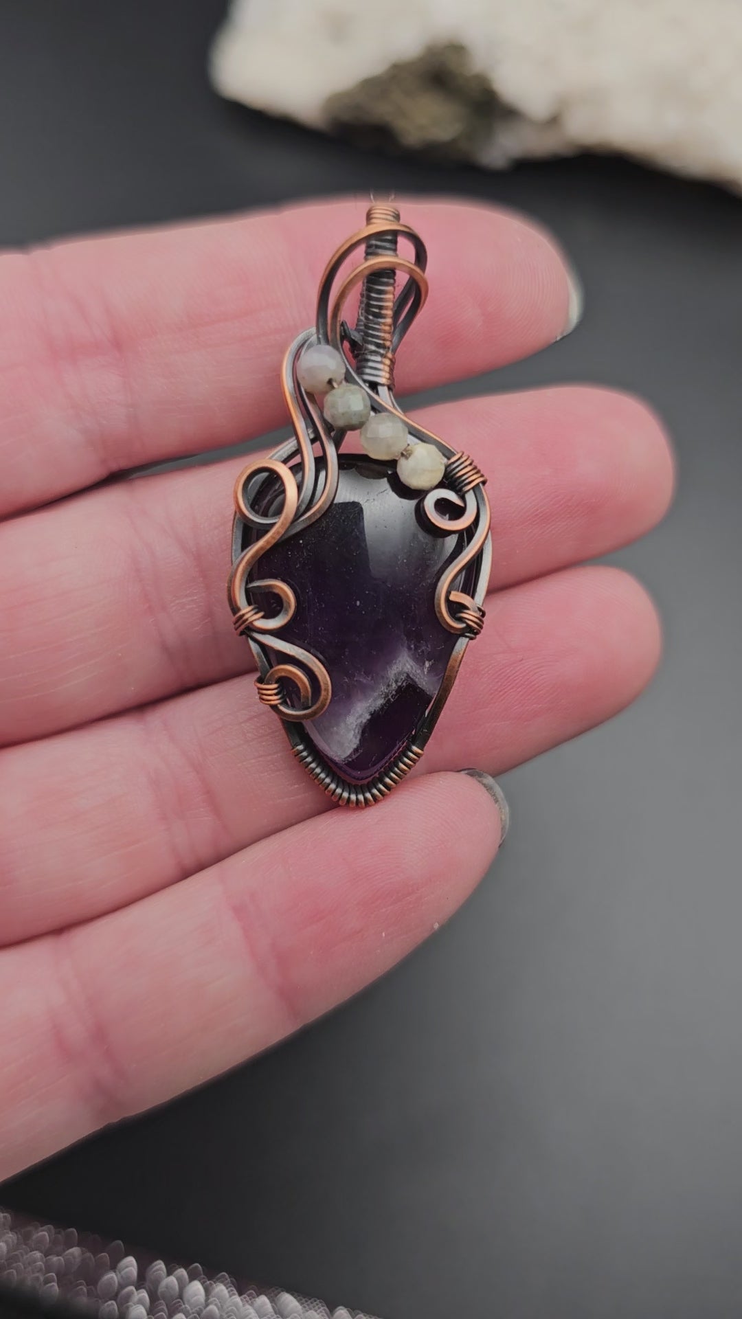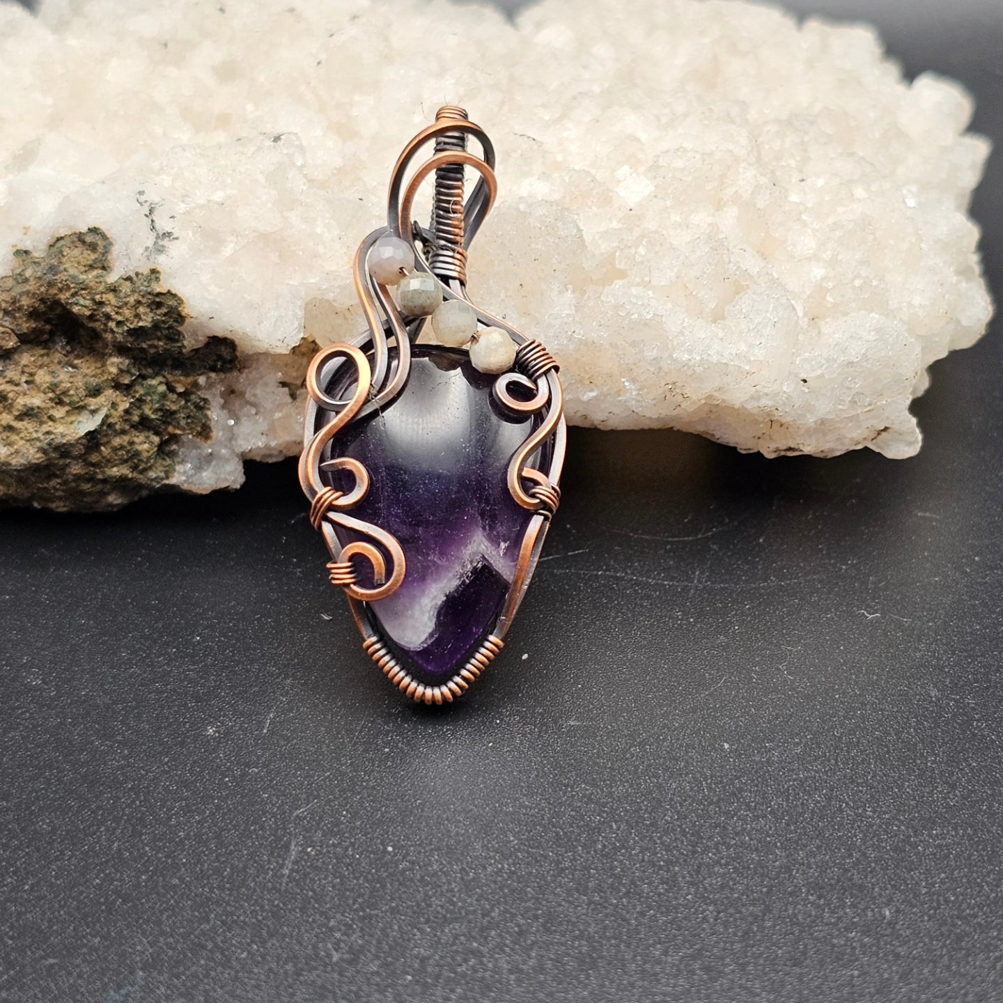 Banded amethyst cabachon, accented with agates and wrapped in oxidized copper. An 18" chain is included.